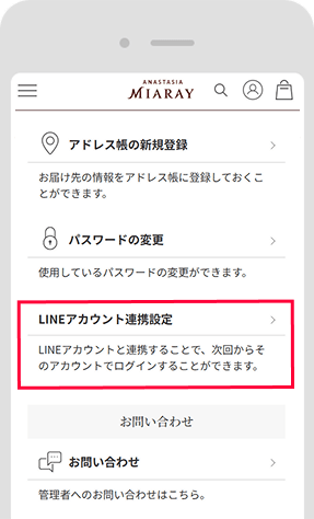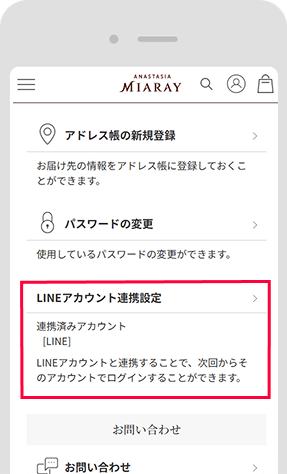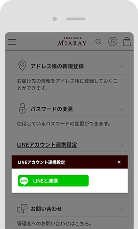 LINE ID連携とは、LINEアカウントとアナスタシア ミアレ公式オンラインショップの会員登録を連携させることです。